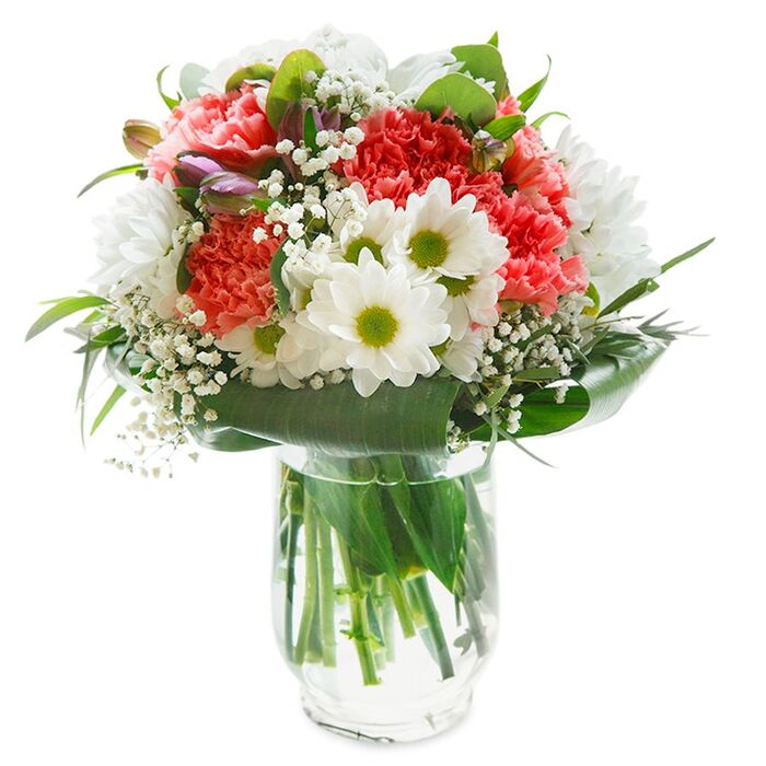 Delight someone special with our beautifully curated seasonal flower arrangement. This bouquet features a harmonious blend of snow-white chrysanthemums and gypsophila, paired with light pink carnations and elegantly wrapped in aspidistra leaves. The soft color palette and unique design ensure this bouquet stands out, bringing joy and elegance to any occasion.